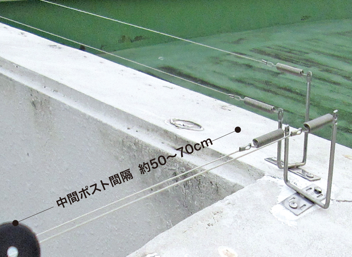 両端ポストは5~10m間隔で設置します。両端ポスト間には中間ポストを50~70cm間隔で配置してください。 ポストの固定方法は接着剤、ビス止め、結束バンドなど、現場に合わせて選択可能です。