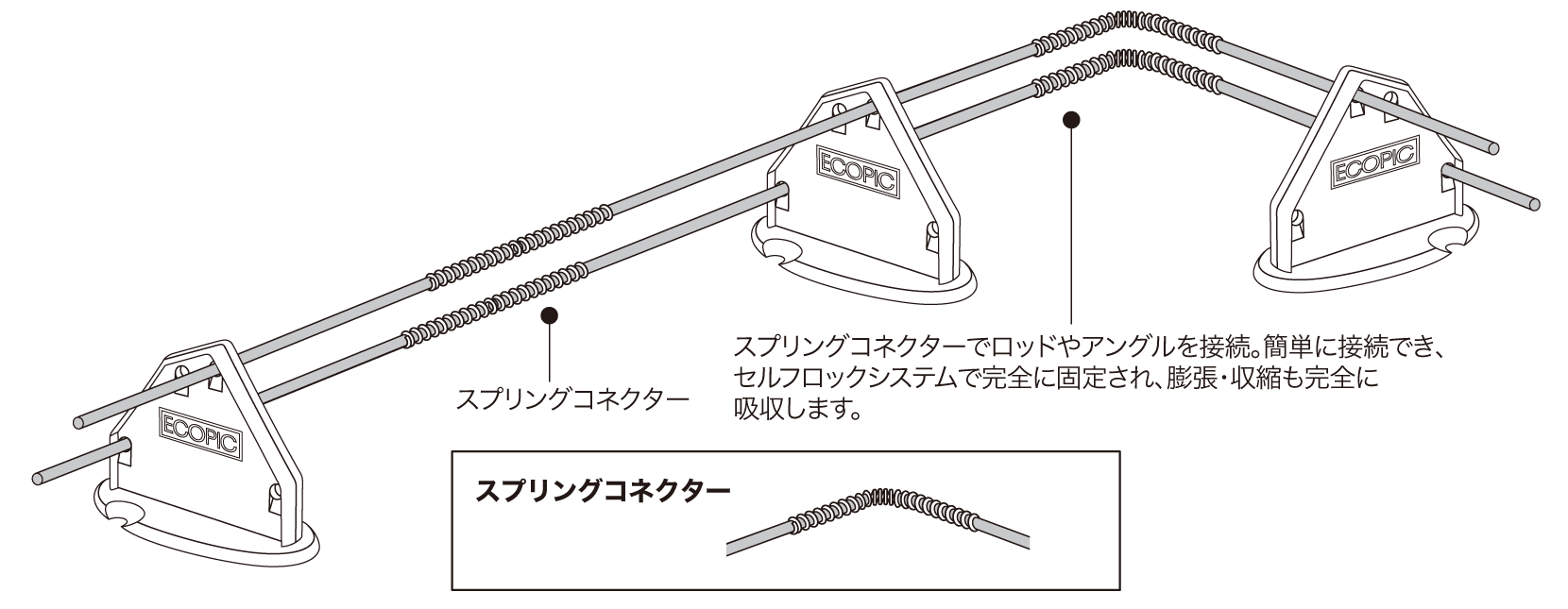 ③バネ式スプリングコネクターで、ステンレスロッド同士を接続