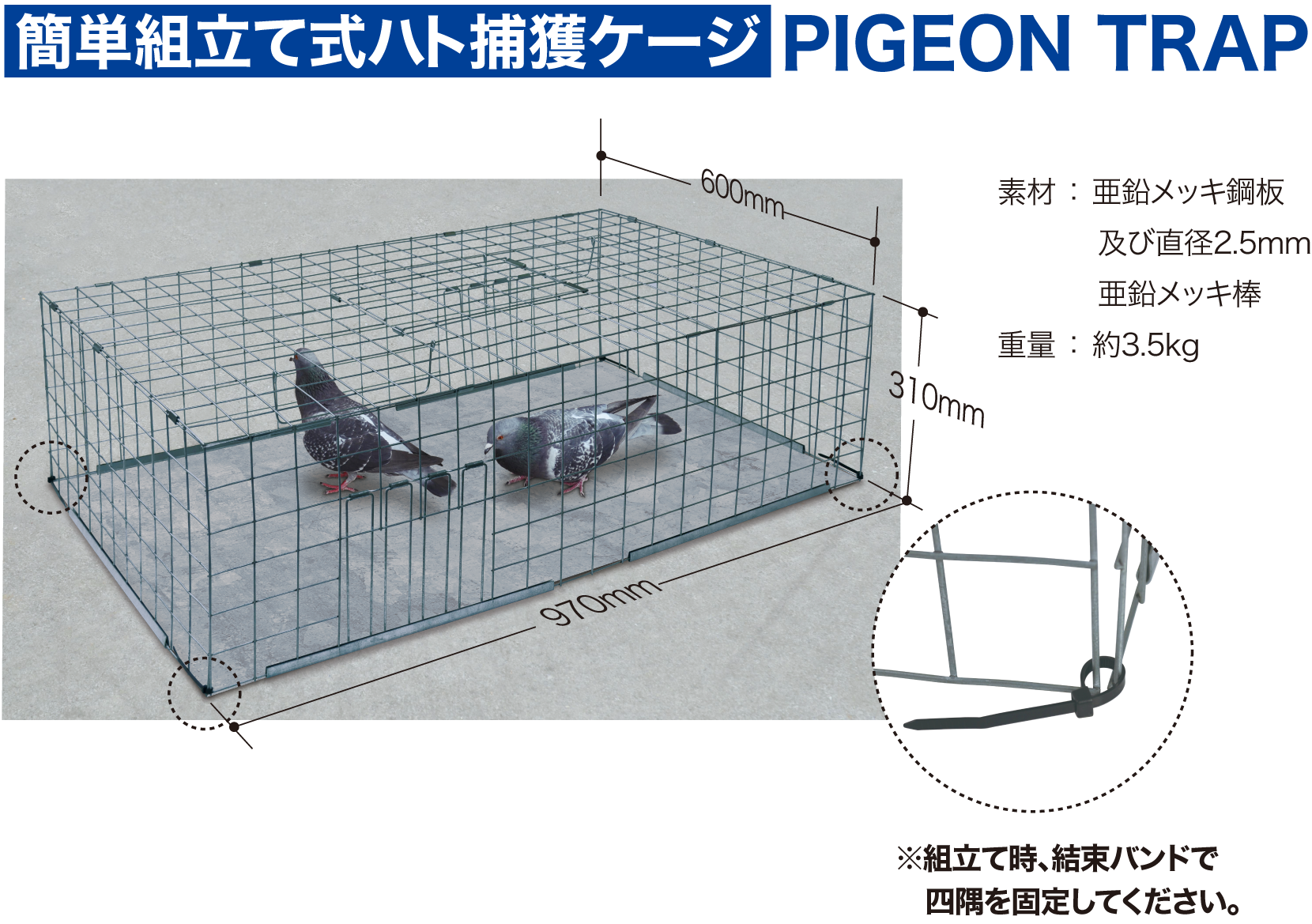 「ピジョントラップ」は、ビルの屋上などに設置し、ハトを生きたまま捕獲することができる組立て式の鳥害対策ケージです。軽量で移動も容易なうえ、不要な時は折り畳んで隙間に収納できるため、大きな保管スペースを必要としない省スペース設計となっています。